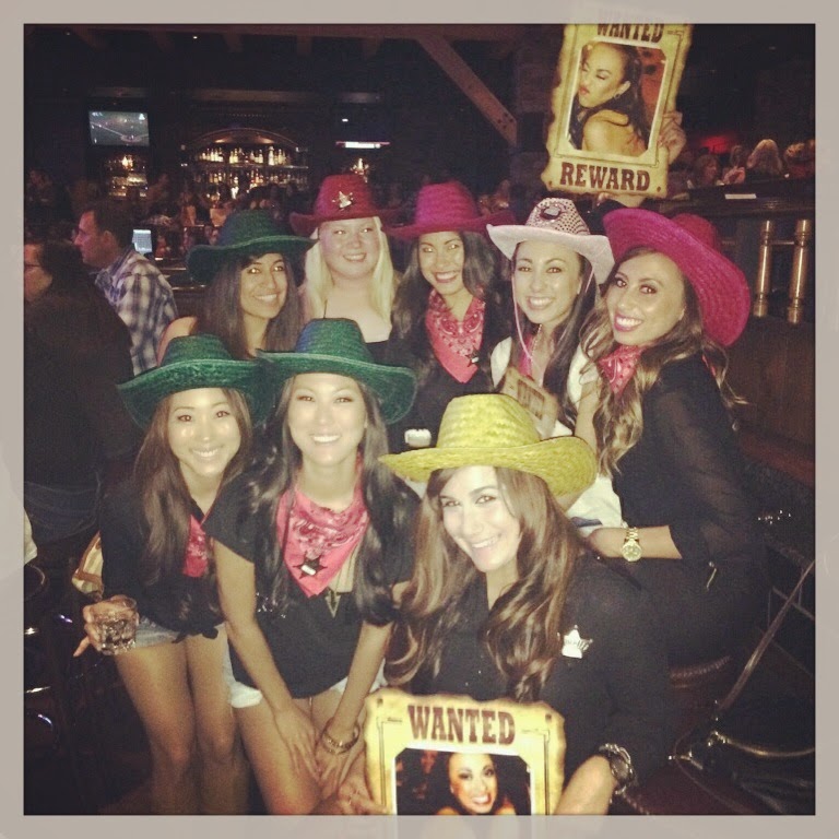 Our group wore cowboy hats, sheriff badges and bandanas to get in the spirit; and we wore black, while the bride wore white!